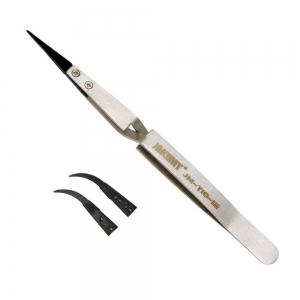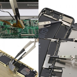 This precision tweezers set is designed for holding small components on cell phone logic boards with ease. The Cross Type tweezers feature a 125mm stainless steel handle and a replaceable head made of special fiber plastic materials.