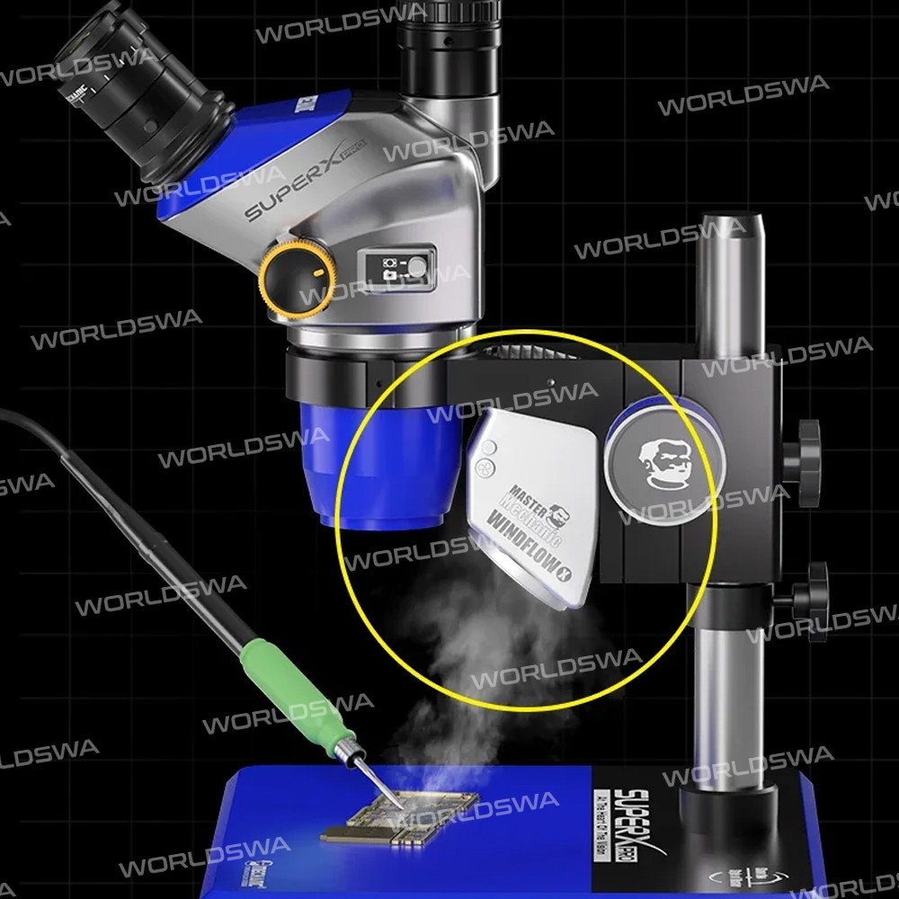 The Mechanic Windflow X microscope fume extraction instrument is designed to protect human health by sucking away harmful gases. Equipped with a microscope for repair, it prevents internal lens pollution and prolongs the product's life.