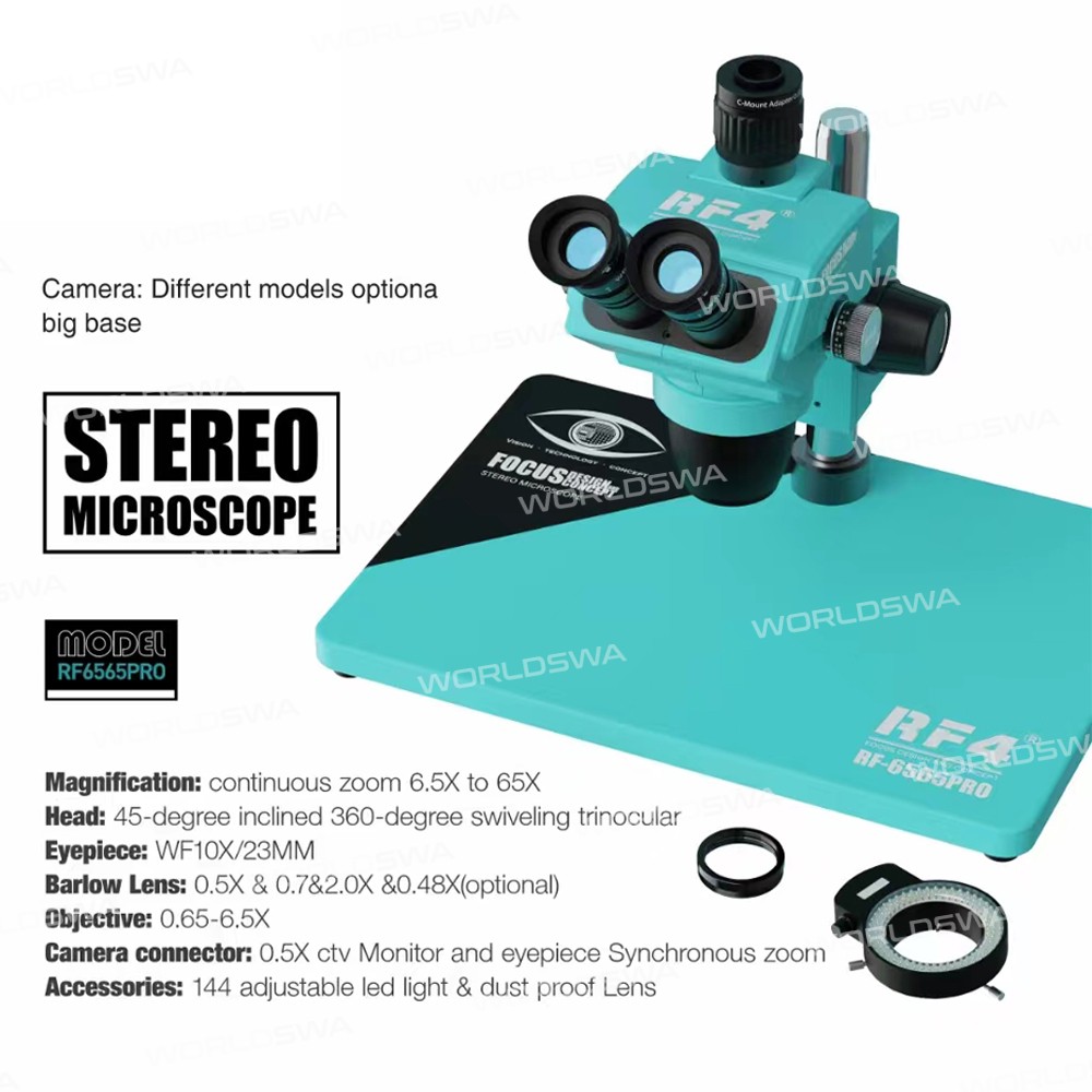 RF4 RF6565Pro 6.5-65X Trinocular Stereo Microscope with Synchronous Zoom and Aluminum Alloy Base
