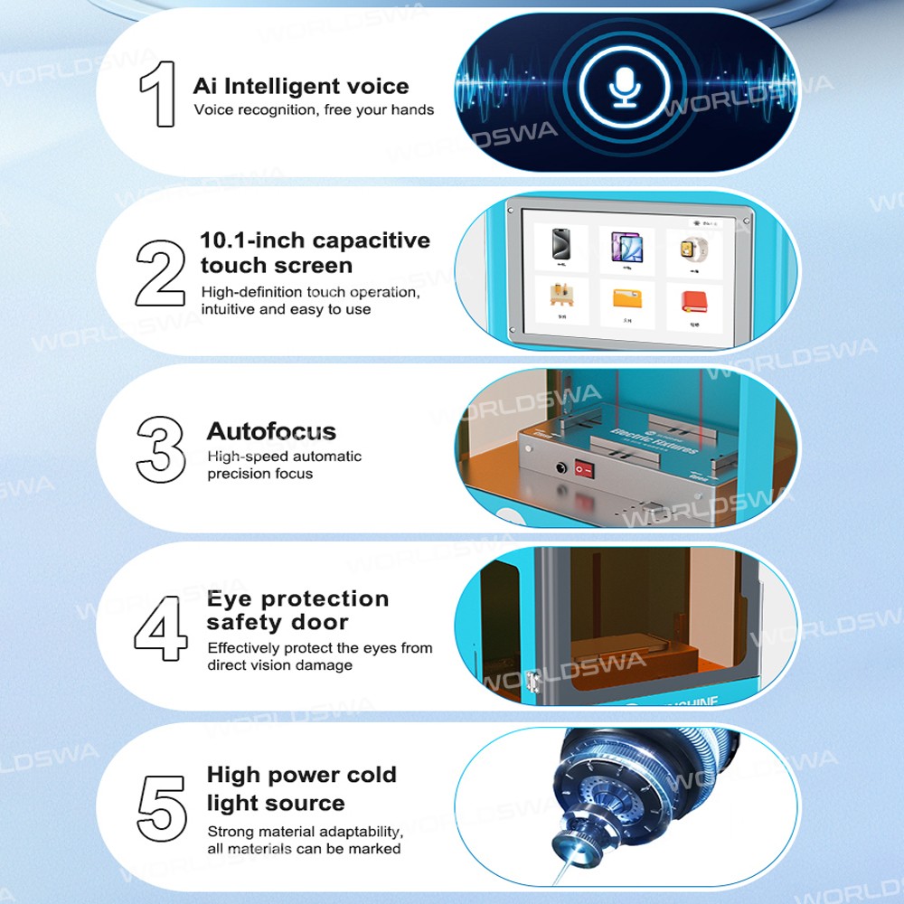 - **Intelligent AI UV Laser Machine**: AI intelligent language control, large touch screen, high-power cold laser