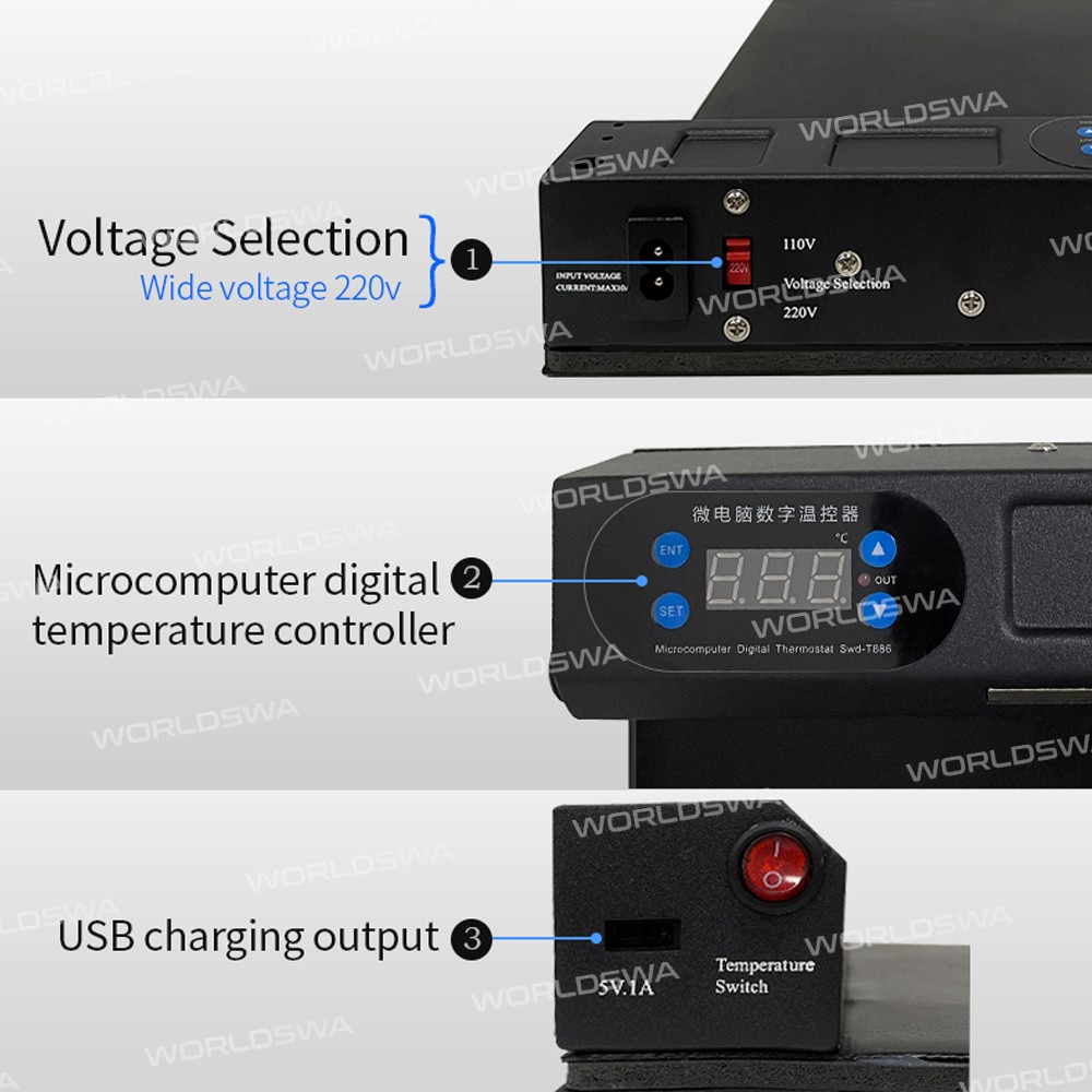 This professional screen split repair heating pad is designed for disassembling various types of tablet phone screens. It features a built-in digital thermostat, 5V/1A USB charging output, and a high temperature resistant, flexible heating pad.