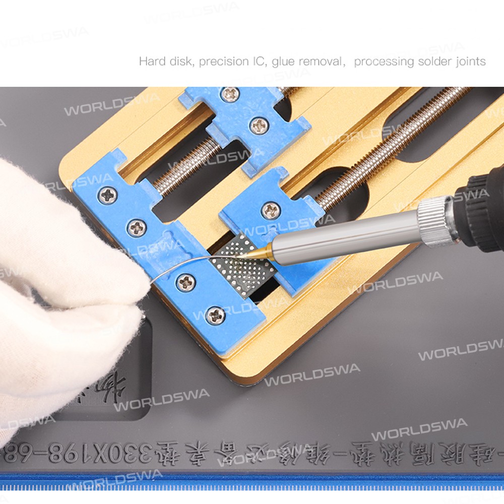 This mobile phone motherboard repair universal maintenance fixture holder is designed with a rotary fixed system, providing a firm and stable hold without rebound. The fixture holder features three adjustable distances to accommodate different motherboard sizes.
